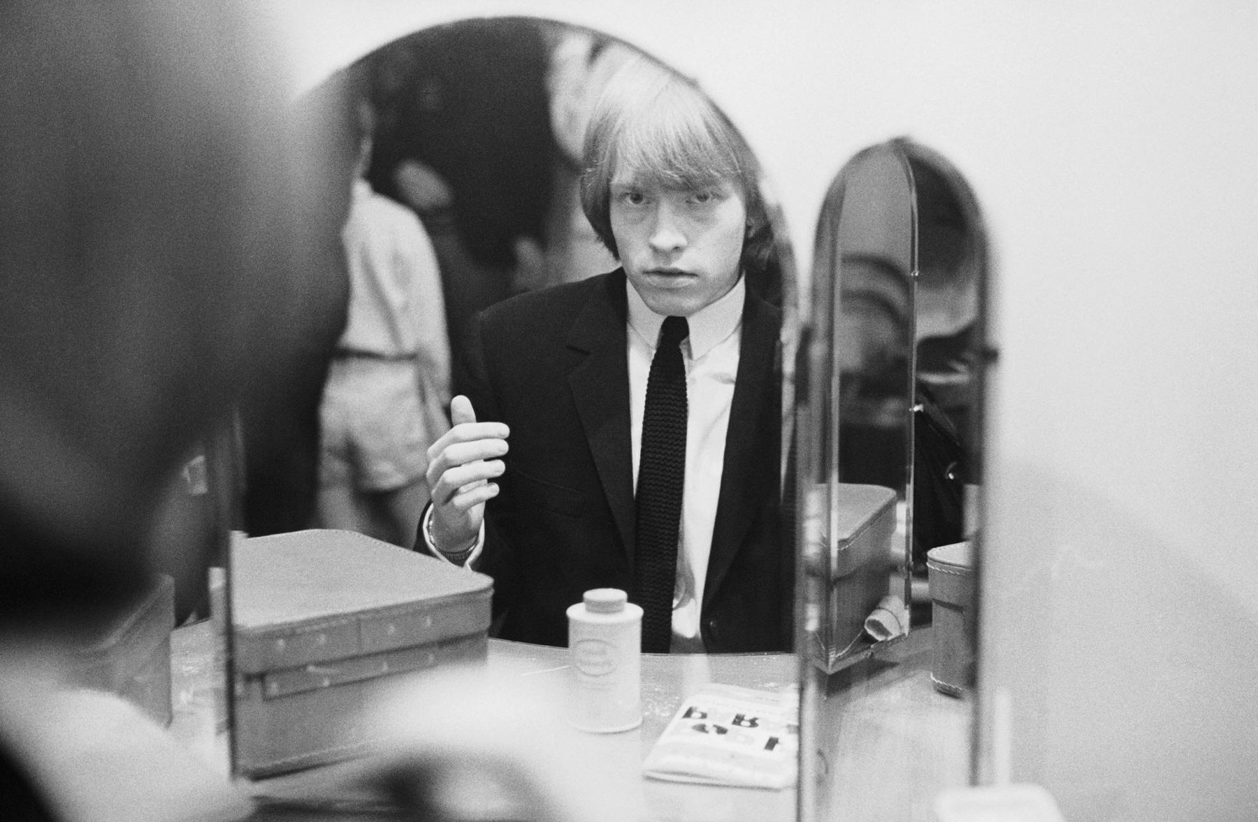 Brian Jones looking in a dressing-table mirror backstage