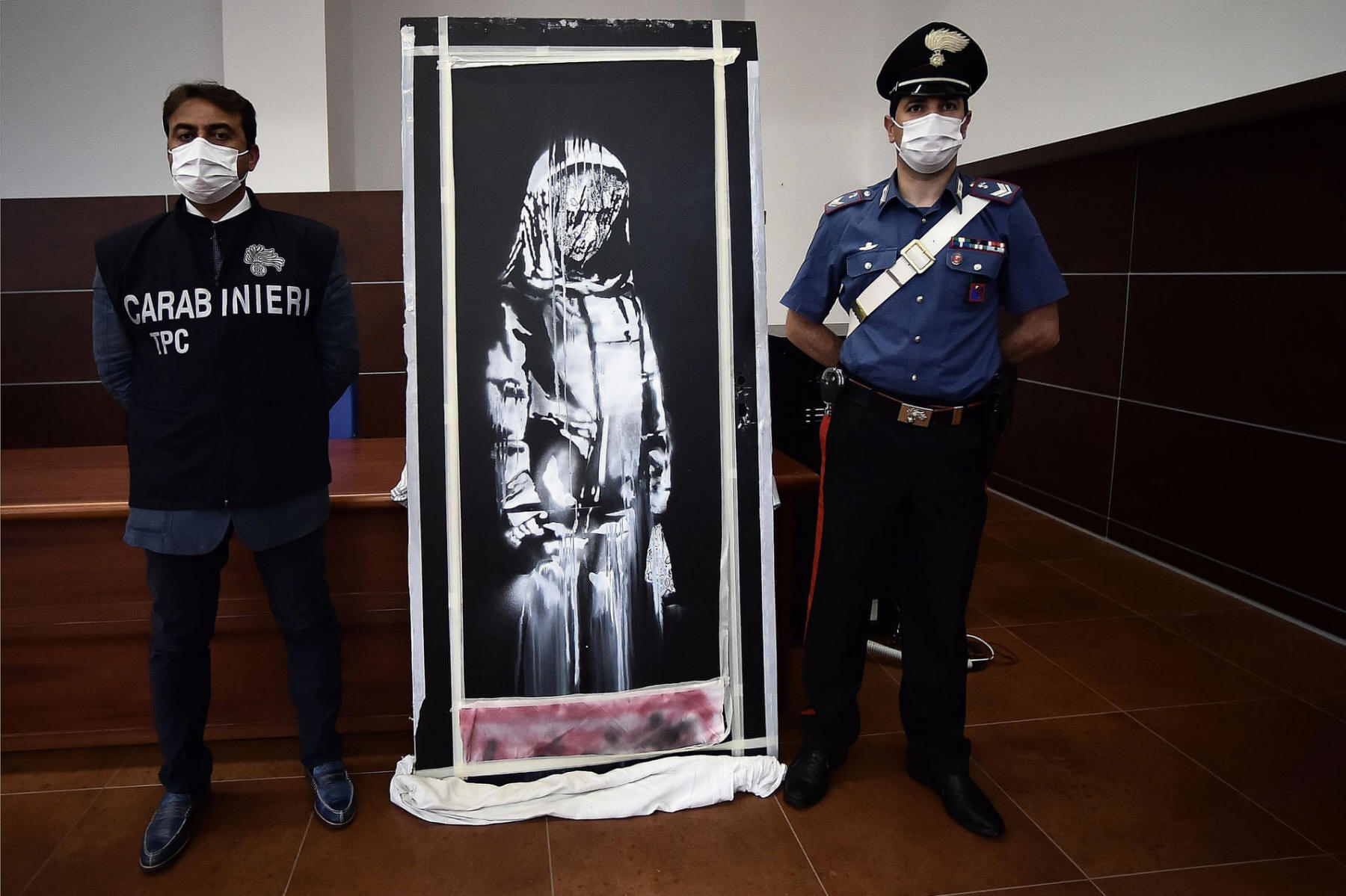 Carabinieri pose next to an artwork