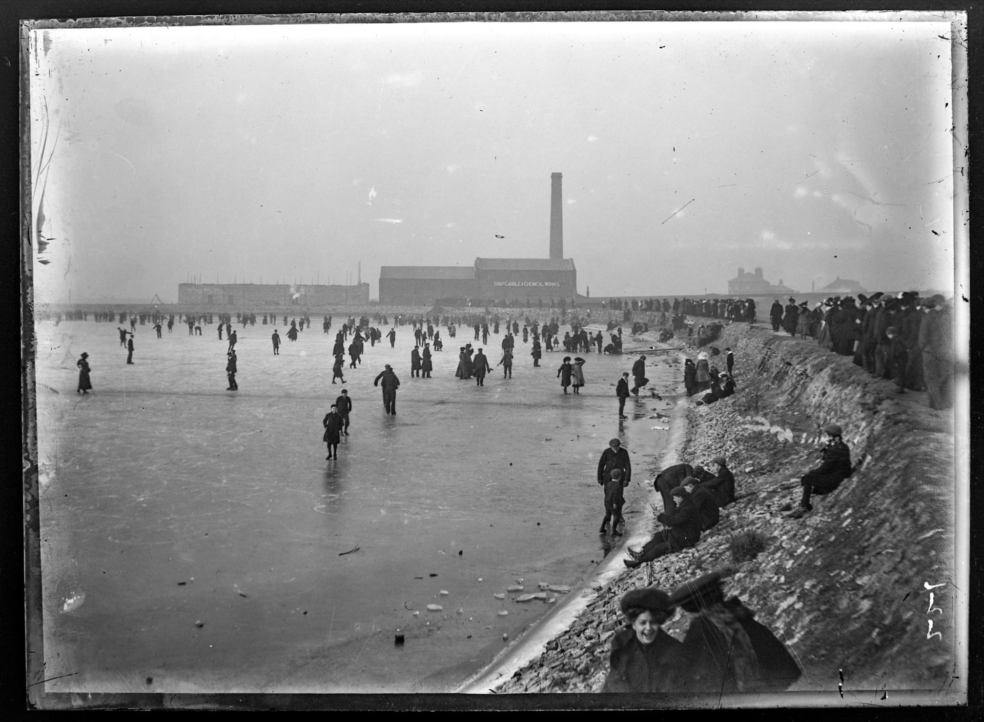 Skating on Ormsgill reservoir, Barrow-in-Furness. P Hodgson & Co’s soap and candle works is visible in the background