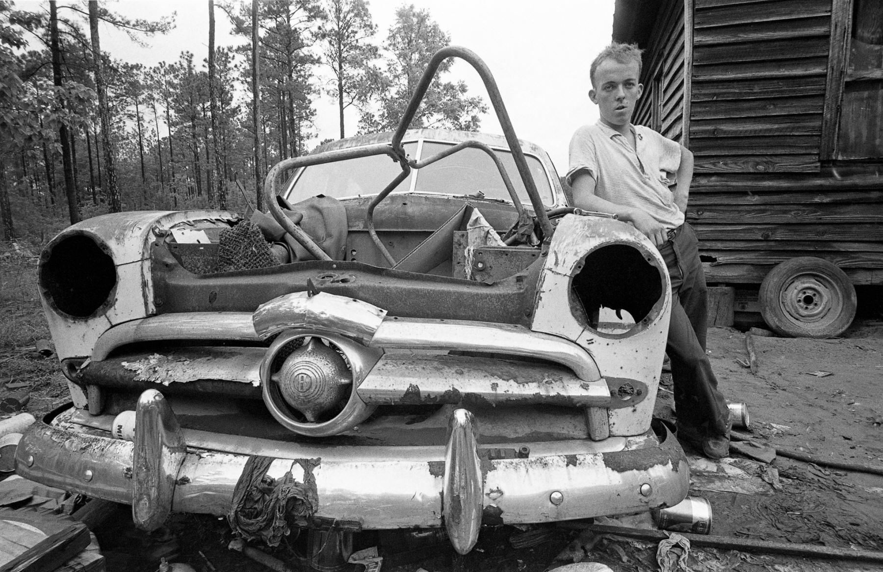 A car being decorated for a Knights of the KKK meeting. Baldwin recalls: ‘Driving through rural Georgia in 1966 I found, to my amazement, cars being decorated to go to a Knights of the Ku Klux Klan meeting.