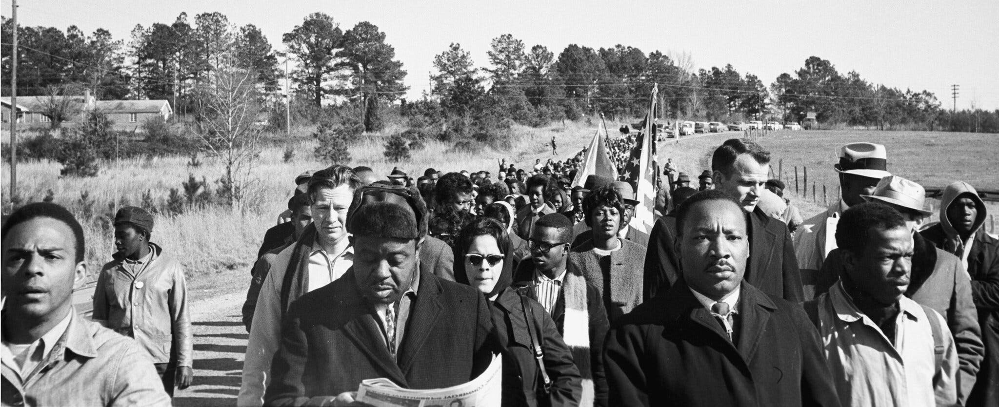 Ralph Abernathy (rear) and Martin Luther King lead the way on the road to Montgomery in 1965. The American flag was a natural symbol for a movement that called on the nation to live up to its principles.