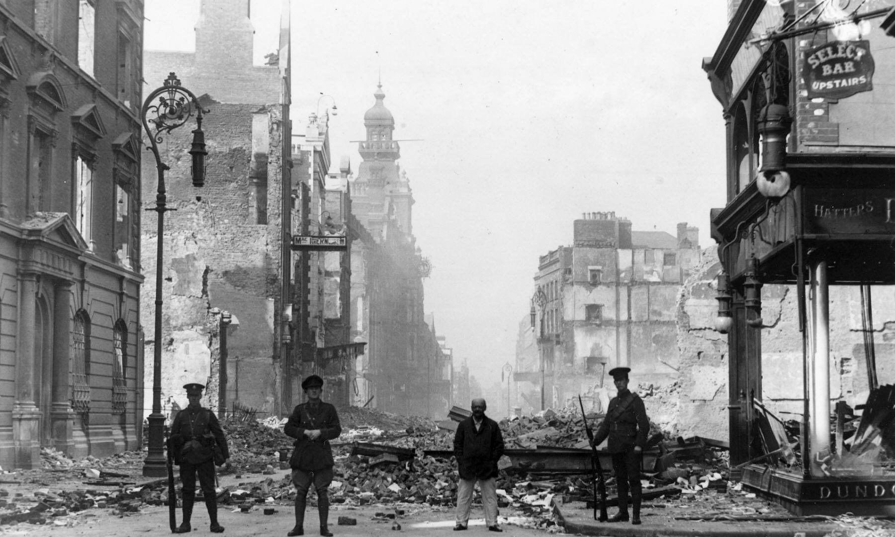 British soldiers stand guard in an area of Dublin destroyed in the 1916 Easter Rising.