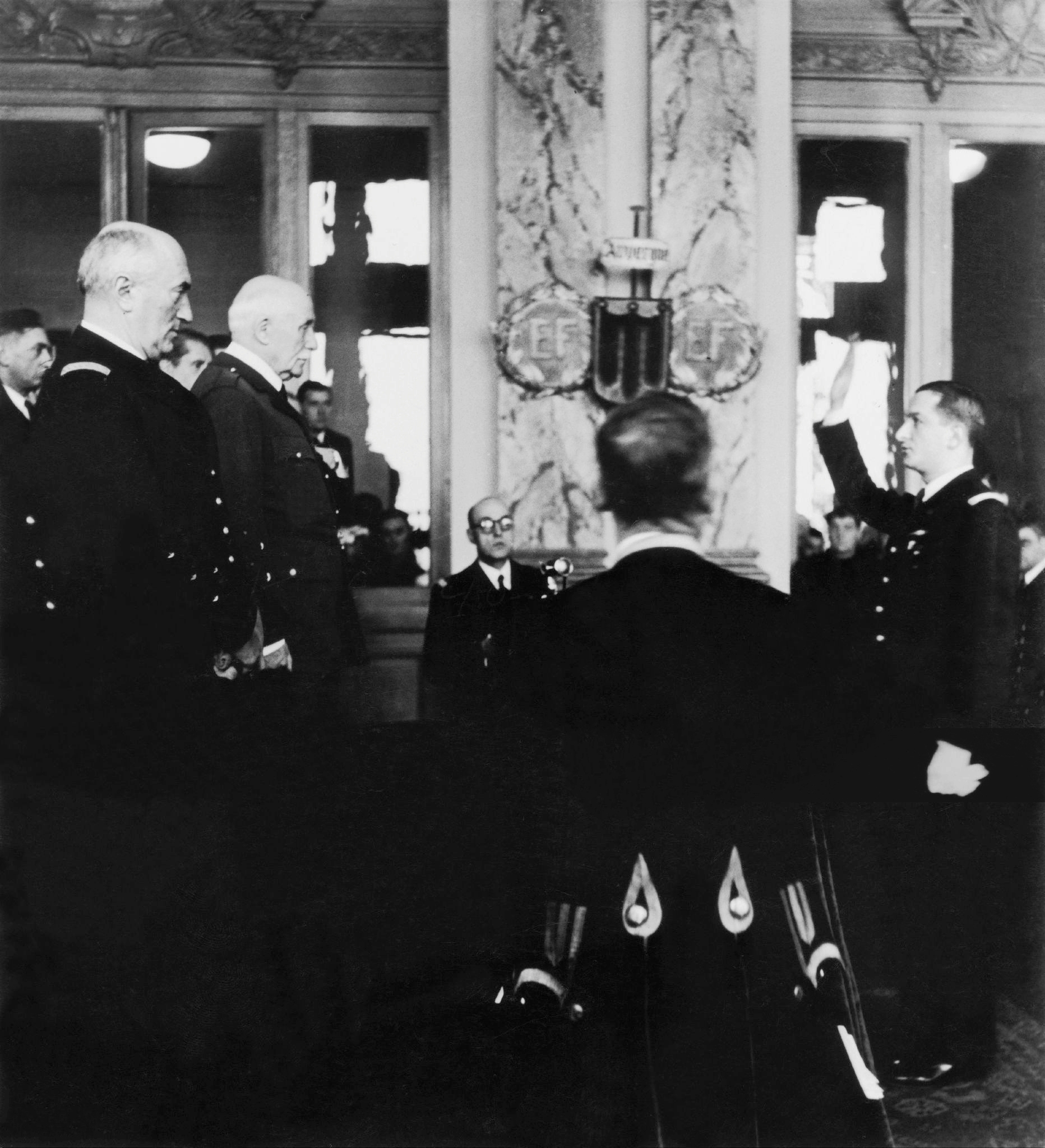 Rene Bousquet, Prefect Of Marne And Prefect Of The Champagne-Ardenne Region Taking An Oath Of Loyalty To Marshal Petain In Presence Of Admiral Darlan In Vichy On February 19, 1942.