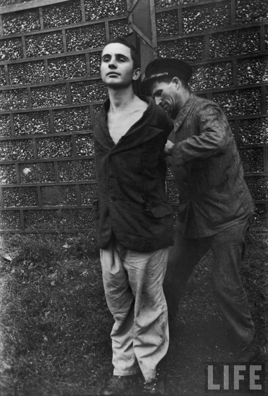 The 2nd of 6 members of the Nazi collaborationist Milice (Vichy police) being tied to a post by a guard moments before being shot to death by a Maquis firing squad, in front of brick factory where 23 patriots were executed by the Germans in July.