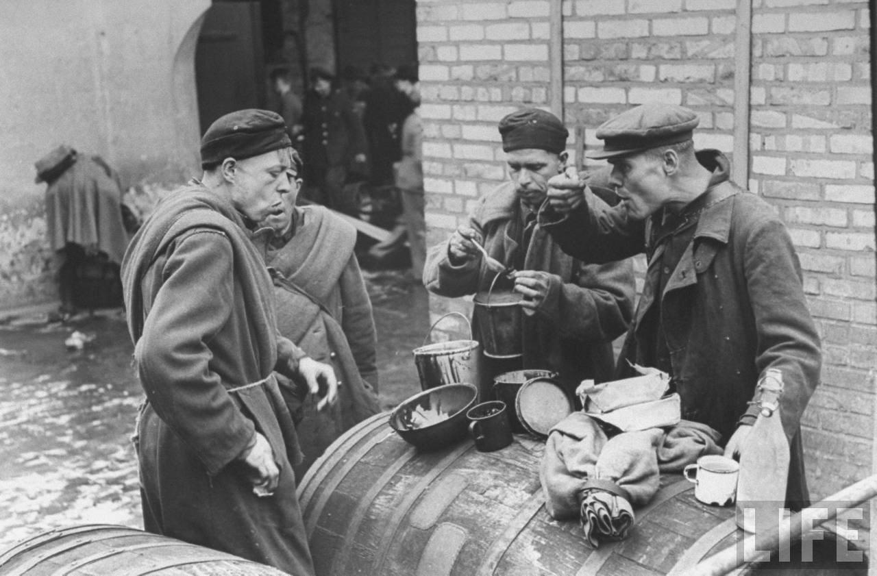 Russian men freed from a Nazi POW slave labor camp eat bread and molasses from a cask outside a looted liquor store after their liberation by advancing Allied troops