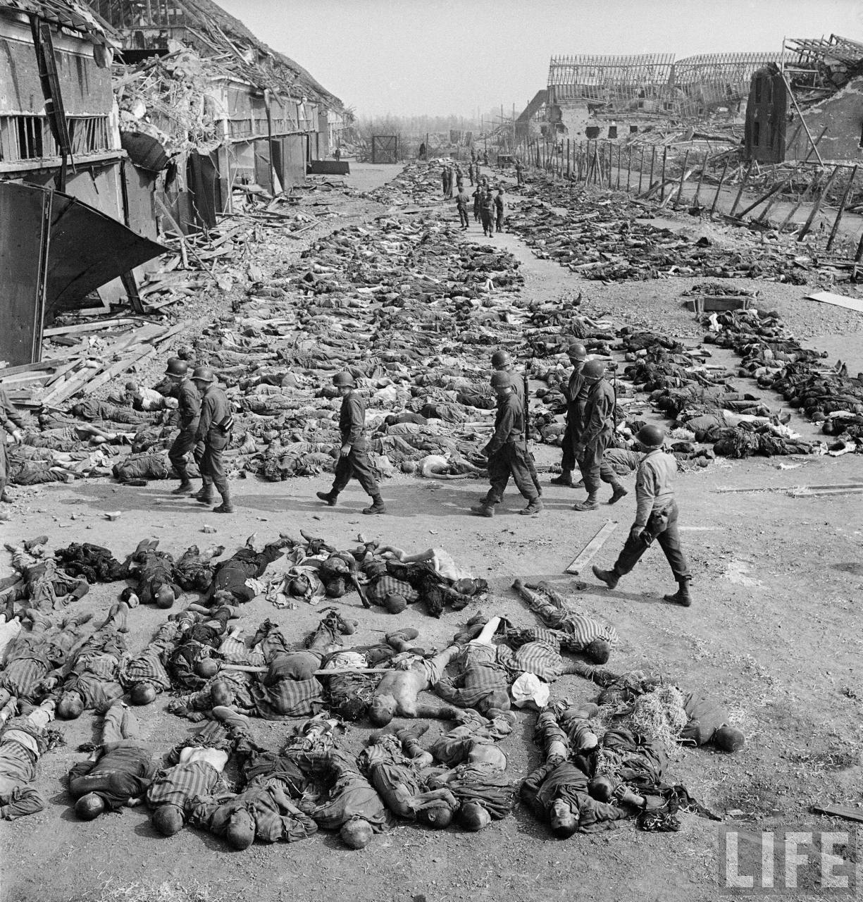 American soldiers walking past rows and rows of corpses at the Nordhausen concentration camp just after its liberation.