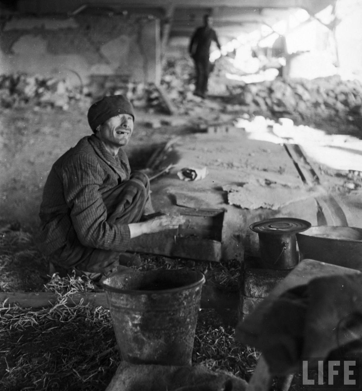Freed prisoner, face twisted w. grief & relief, after the Nordhausen concentration camp was liberated by Allied troops.