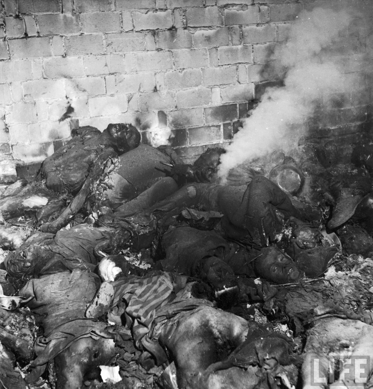 Smoke still rising from corpses of prisoners at the concentration camp at Gardelegen who were burned alive by their Nazi captors.