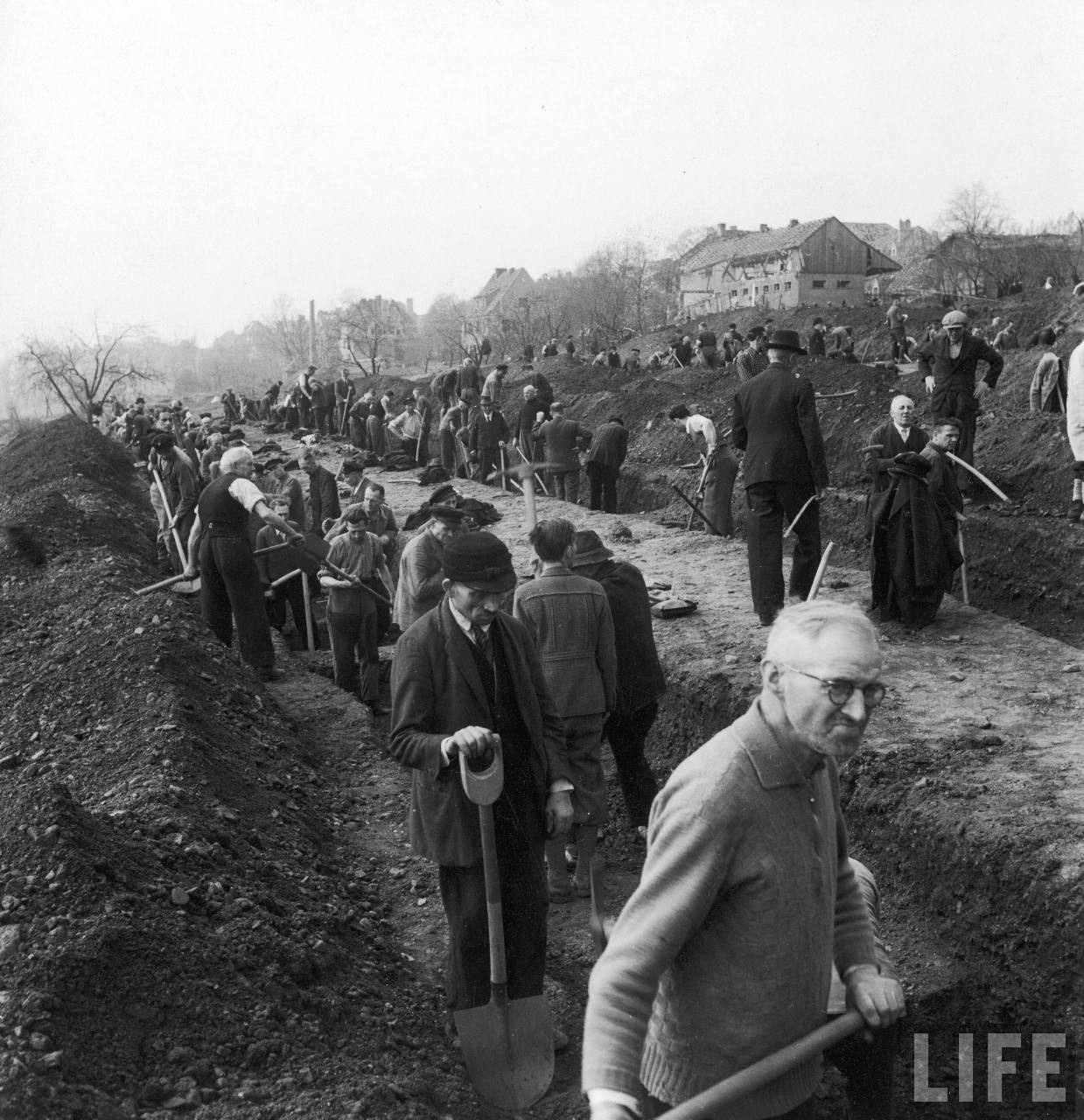 German male civilians being forced by the Allies to dig graves for the prisoners killed at the Nordhausen concentration camp.