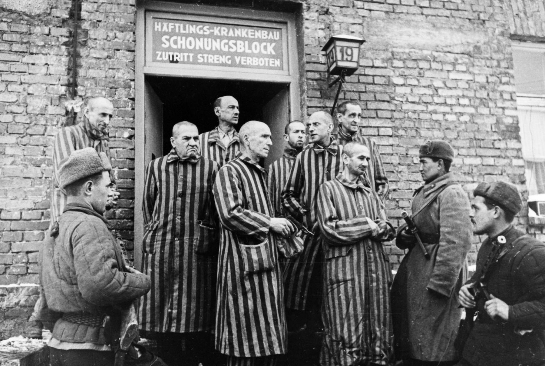Soviet Red Army soldiers with liberated prisoners of the Auschwitz concentration camp in Oswiecim, Poland, in 1945.