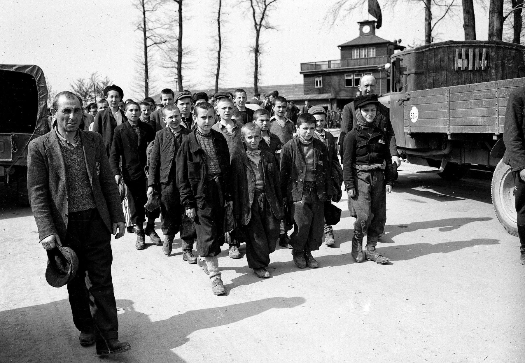 Children and other prisoners liberated by the U.S. Army march from Buchenwald concentration camp near Weimar, Germany, to an American hospital to receive treatment in April 1945.