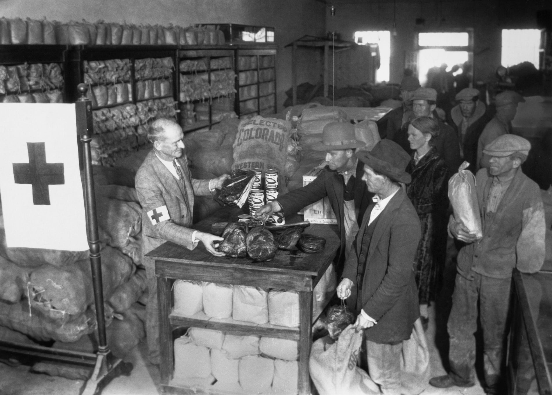 Drought victims collecting food and clothing from a warehouse set up by the American Red Cross, in Lonoke, Arkansas, circa 1930.