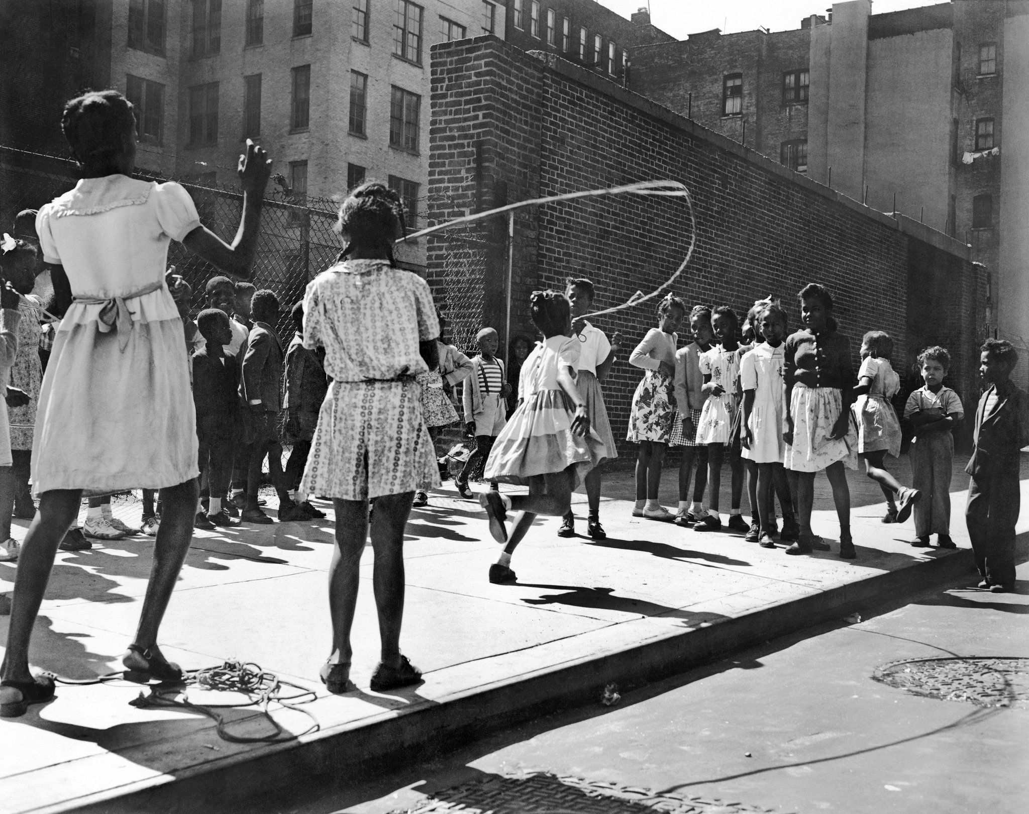 A girl skips rope amid a crowd of children on a lazy summer afternoon.