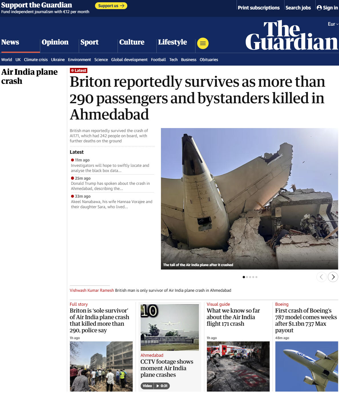 Briton reportedly survives as more than 290 passengers and bystanders killed in Ahmedabad