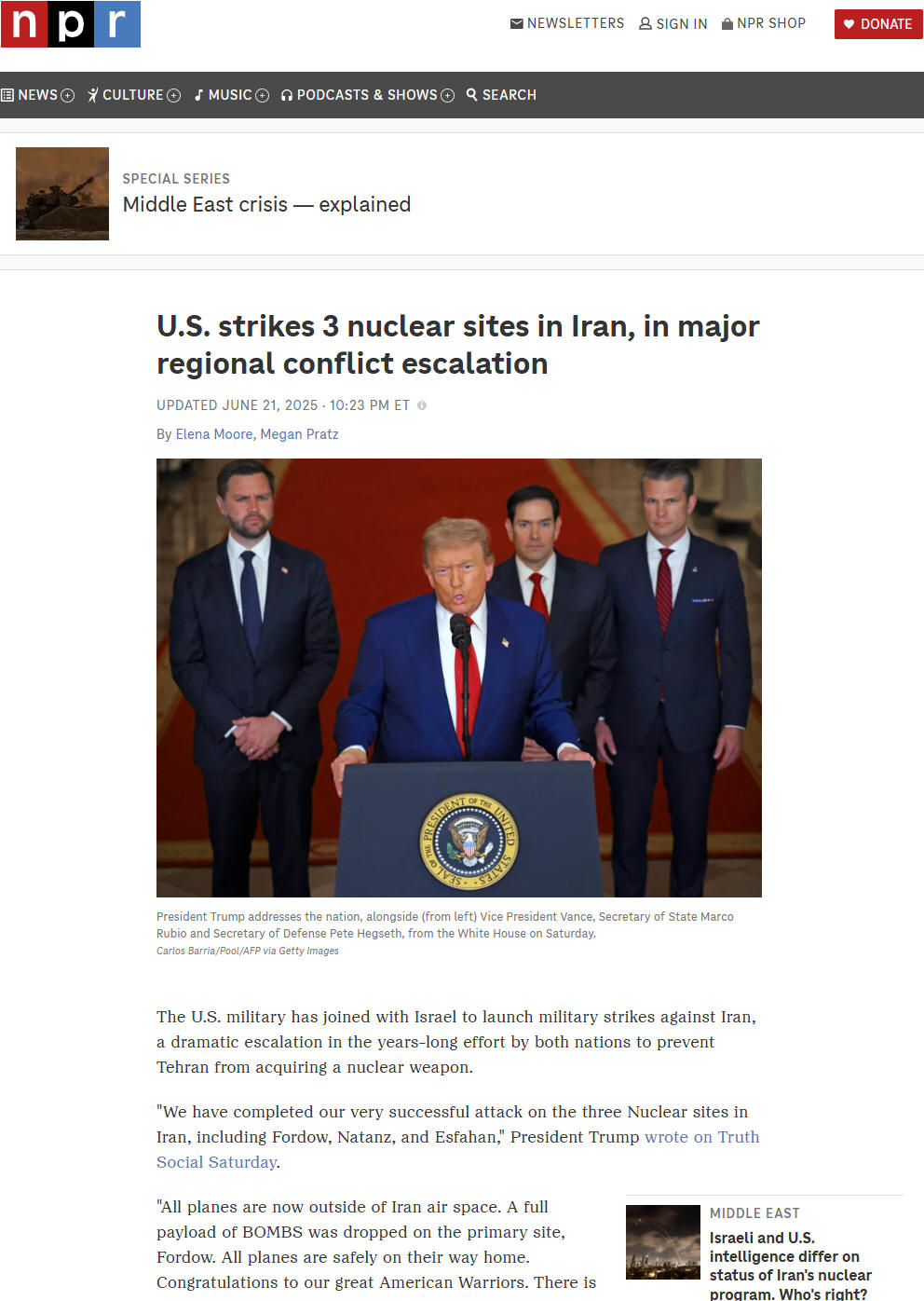 Escalade majeure du conflit au moyen-Orient : Les États-Unis frappent 3 sites nucléaires en Iran