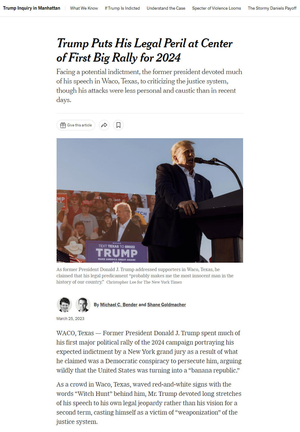 Facing a potential indictment, the former president devoted much of his speech in Waco, Texas, topréposition criticizing the justice system, though his attacks were less personal and caustic than in recent days.