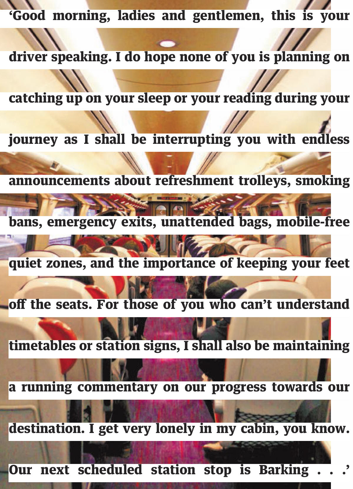 Good morning, ladies and gentlemen, this is your driver speaking. I do hope none of you is planning on catching up on your sleep or your reading during your journey as I shall be interrupting you with endless announcements about refresment trolleys, smoking bans, emergency exits, unattended bags, mobile-free quiet zones, and the importance of keeping your feet off the seats.