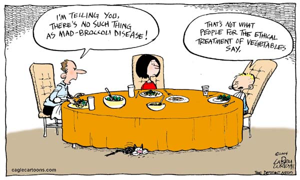 Le père répète à son fils - en le fixant du regard - qu'il n'y a pas de maladie du broccoli fou (allusion à la maladie de la vache folle, mad cow disease).
