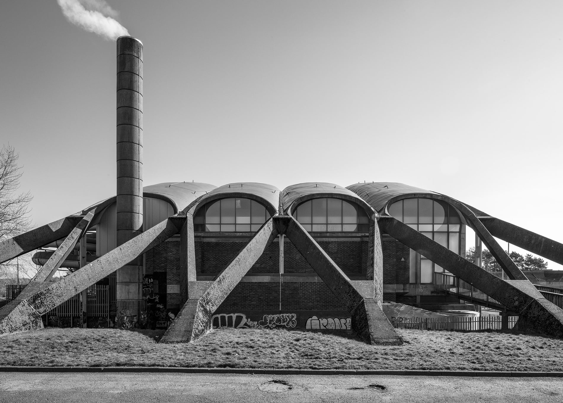 featuring a monumental vaulted pool hall supported by splayed concrete ribs.