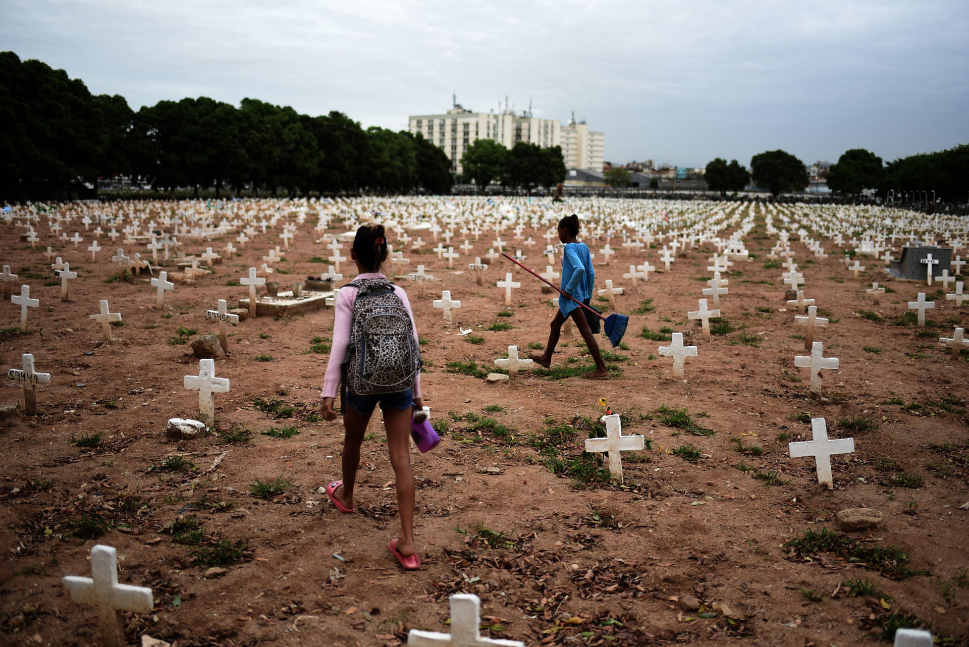 Two girls walk across a graveyard in Rio de Janeiro, Brazil.