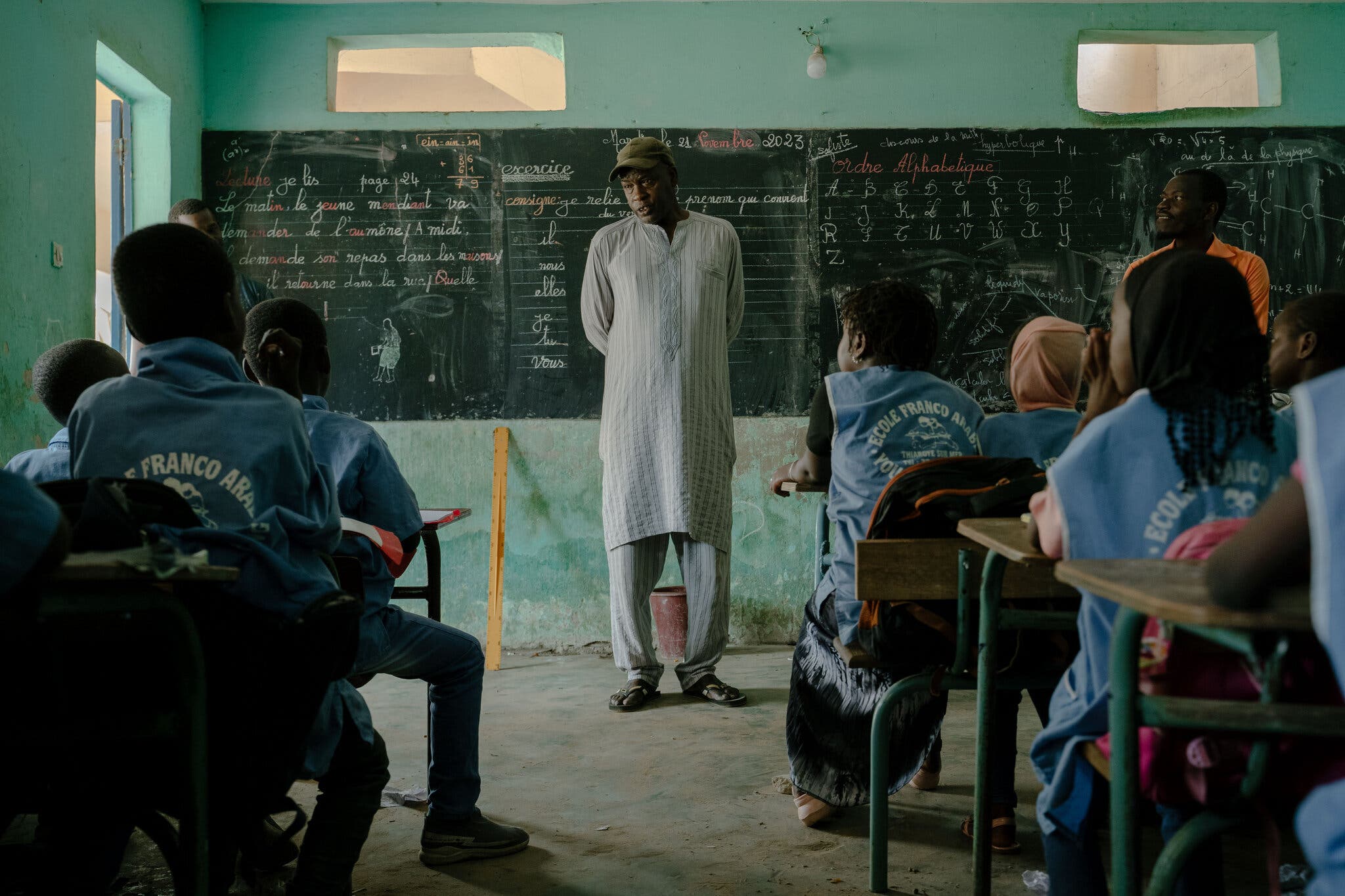 Moustapha Diouf, who survived a disastrous voyage at sea while trying to migrate to Spain, speaking to students about the dangers of emigration at an elementary school in Senegal.