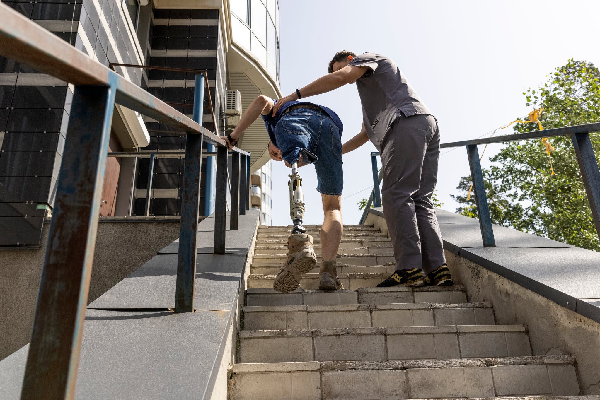 Vladyslav Tkachenko practicing stairs in Kyiv with a physical therapist.