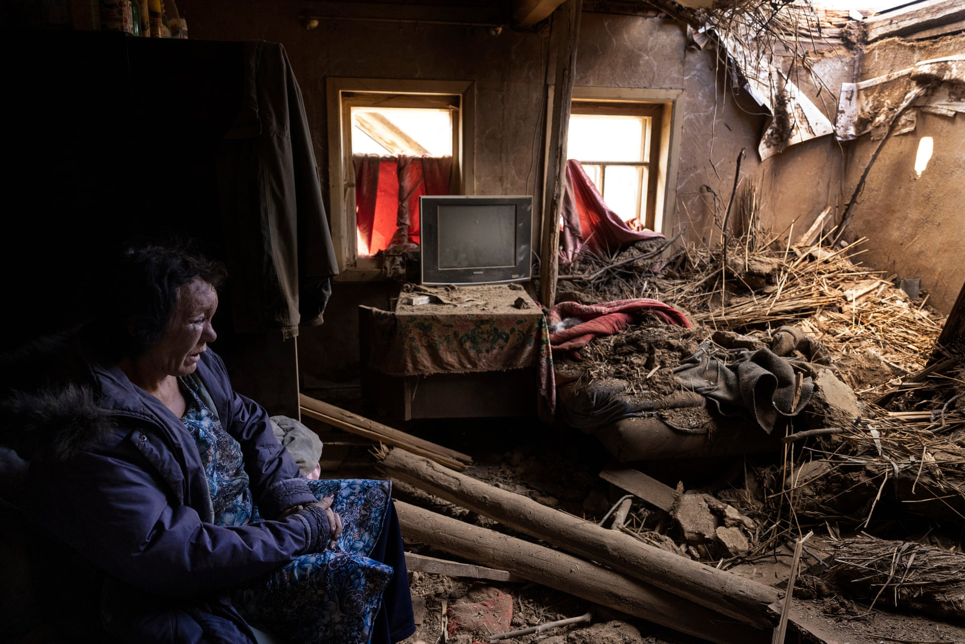 Leda Buzinna sits inside her home, which was seriously damaged by shelling when two S-300 missiles hit a rural neighbourhood in Krasnotorka.