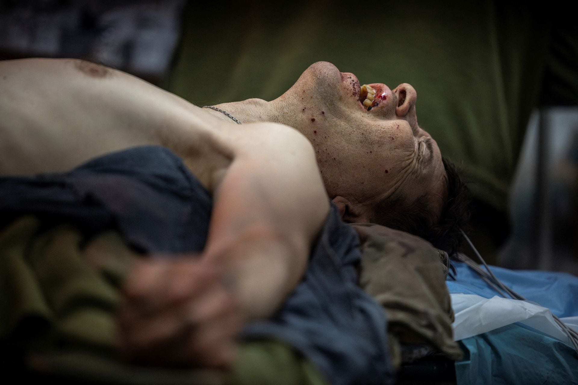 [5/36] A Ukrainian soldier who suffered battlefield wounds lies on a stretcher at a stabilisation point in the Donetsk region, February 24.