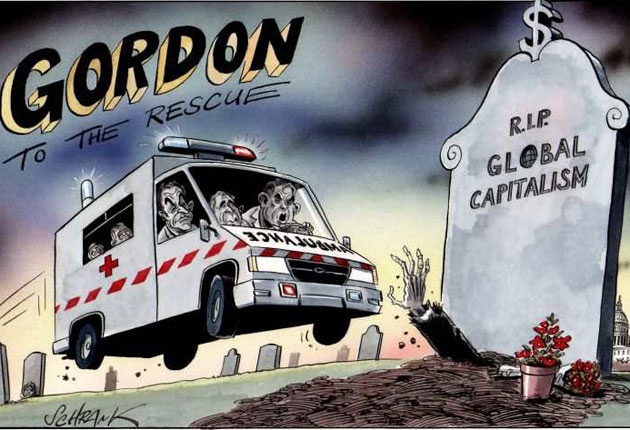 L to R: French President Nicolas Sarkozy, US President George W. Bush, British Prime Minister Gordon Brown