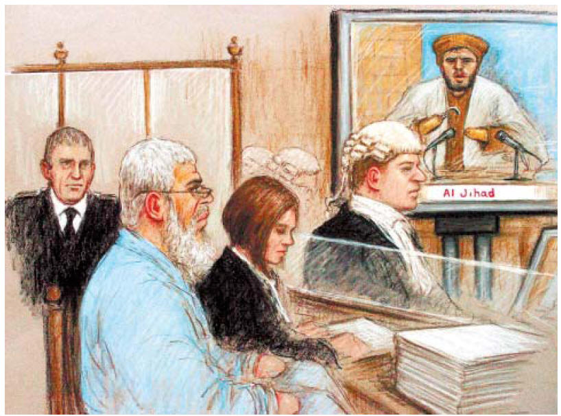 An artist’s impression of Sheik Abu Hamza in the dock at the Old Bailey
