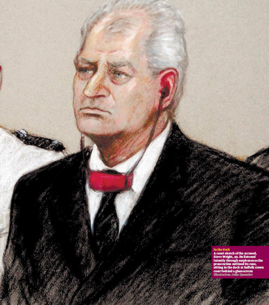 In the dock A court sketch of the accused, Steve Wright, 49. He listened intently through earphones as the prosecution outlined its case, sitting in the dock at Suff olk crown court behind a glass screen