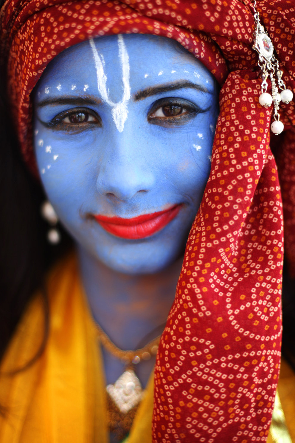 A girl dressed as Krishna poses at the Janmashtami Hindu Festival at Bhaktivedanta Manor.