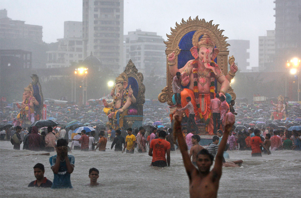 Indian Hindu devotees gather with large statues of the elephant-headed Hindu God Ganesh, before immersing them in the Arabian Sea, on the final day of the festival of Ganesh Chaturthi in Mumbai, India, Thursday, Sept. 3, 2009.