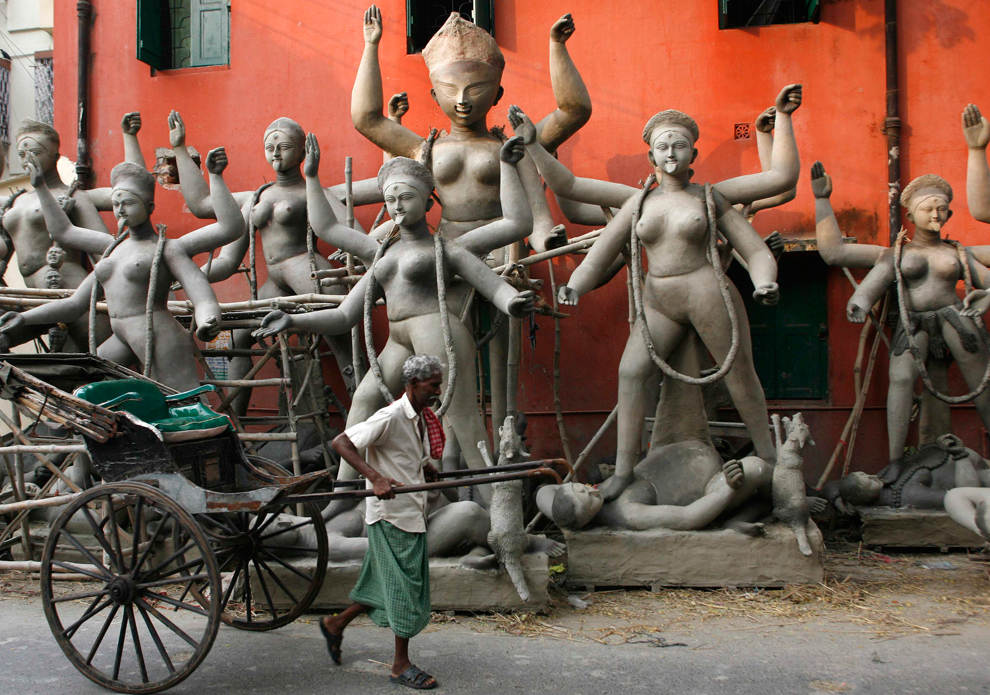 A rickshaw puller passes in front of unfinished idols of Hindu goddess Kali outside a workshop in the eastern Indian city of Kolkata October 14th, 2009
