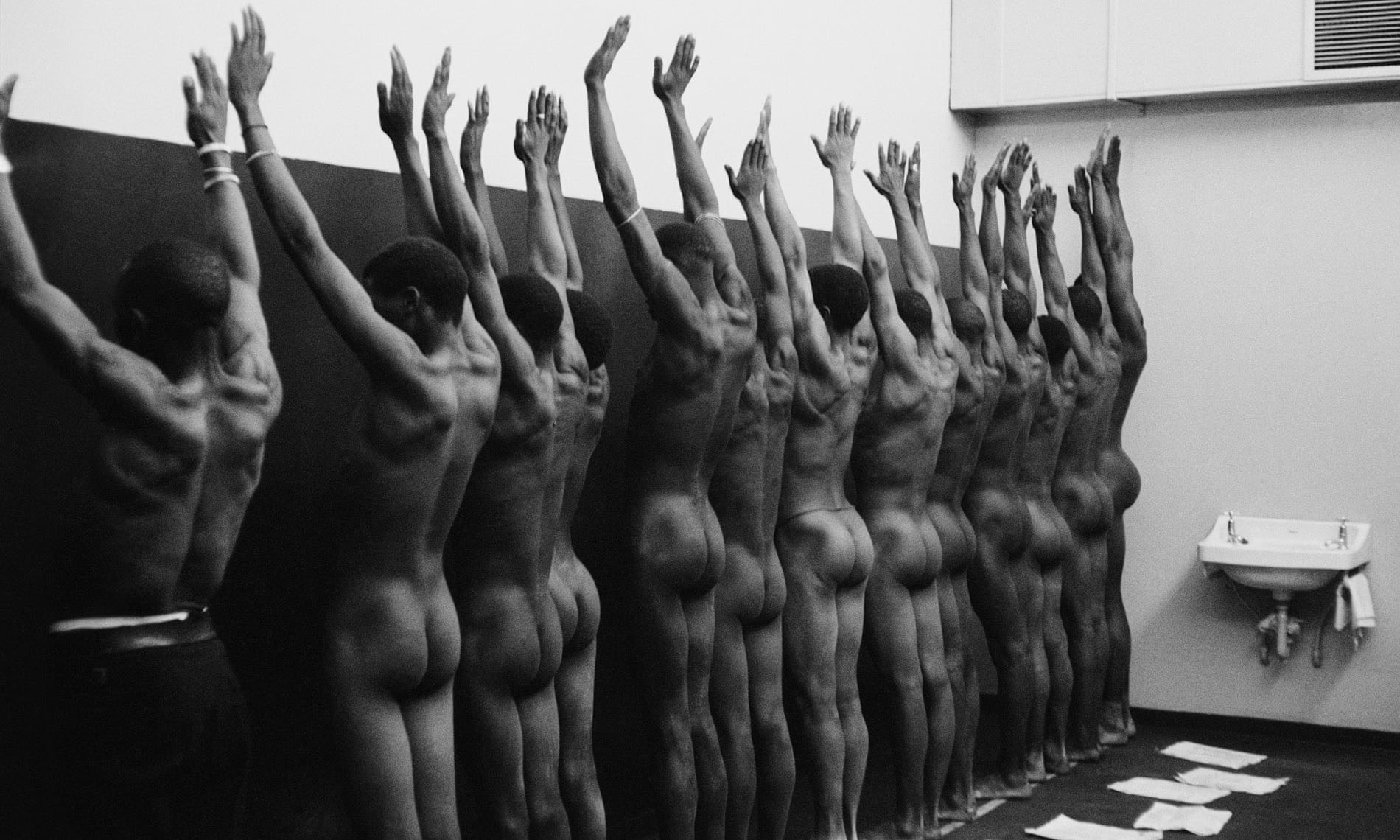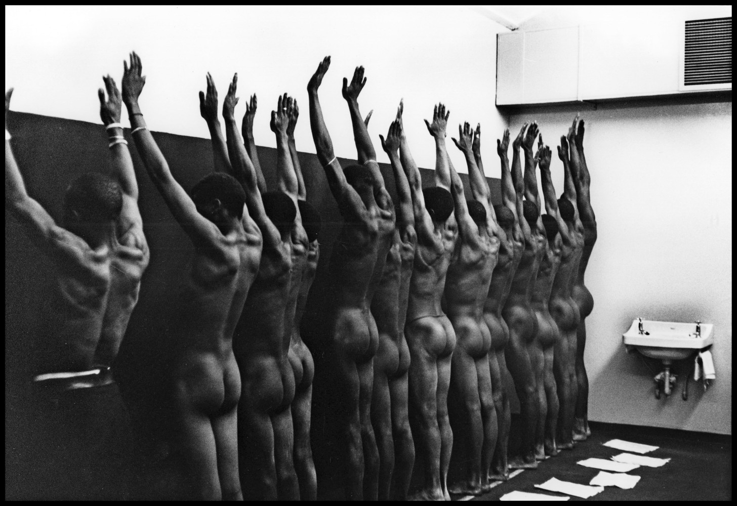 Agroup of Black men stand naked in a line with their arms up, facing the wall, as they undergo a medical examination before being sent to work in the mines.