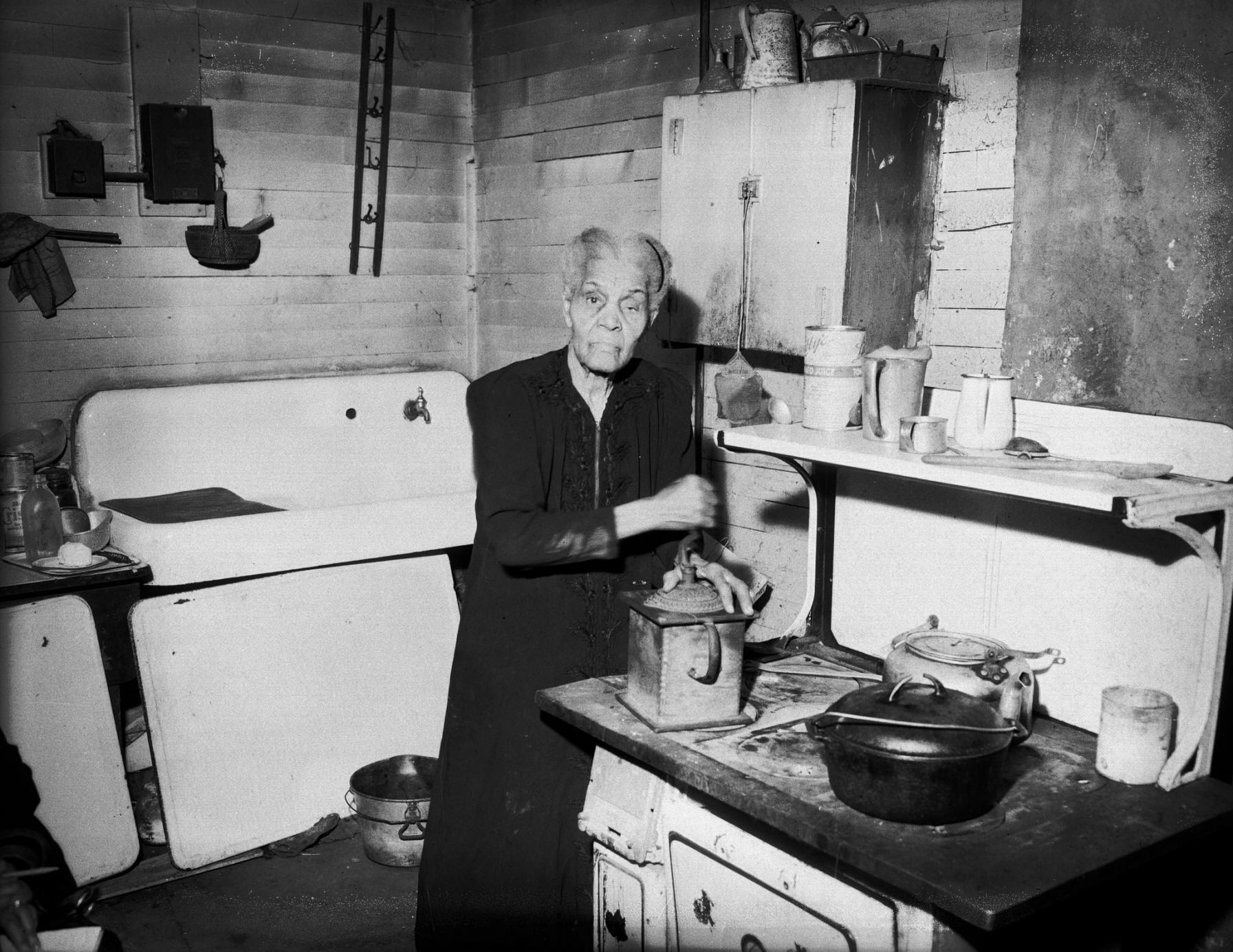 The centenarian Lucy Slater grinding coffee in her kitchen. Ben Avon. April 1953.