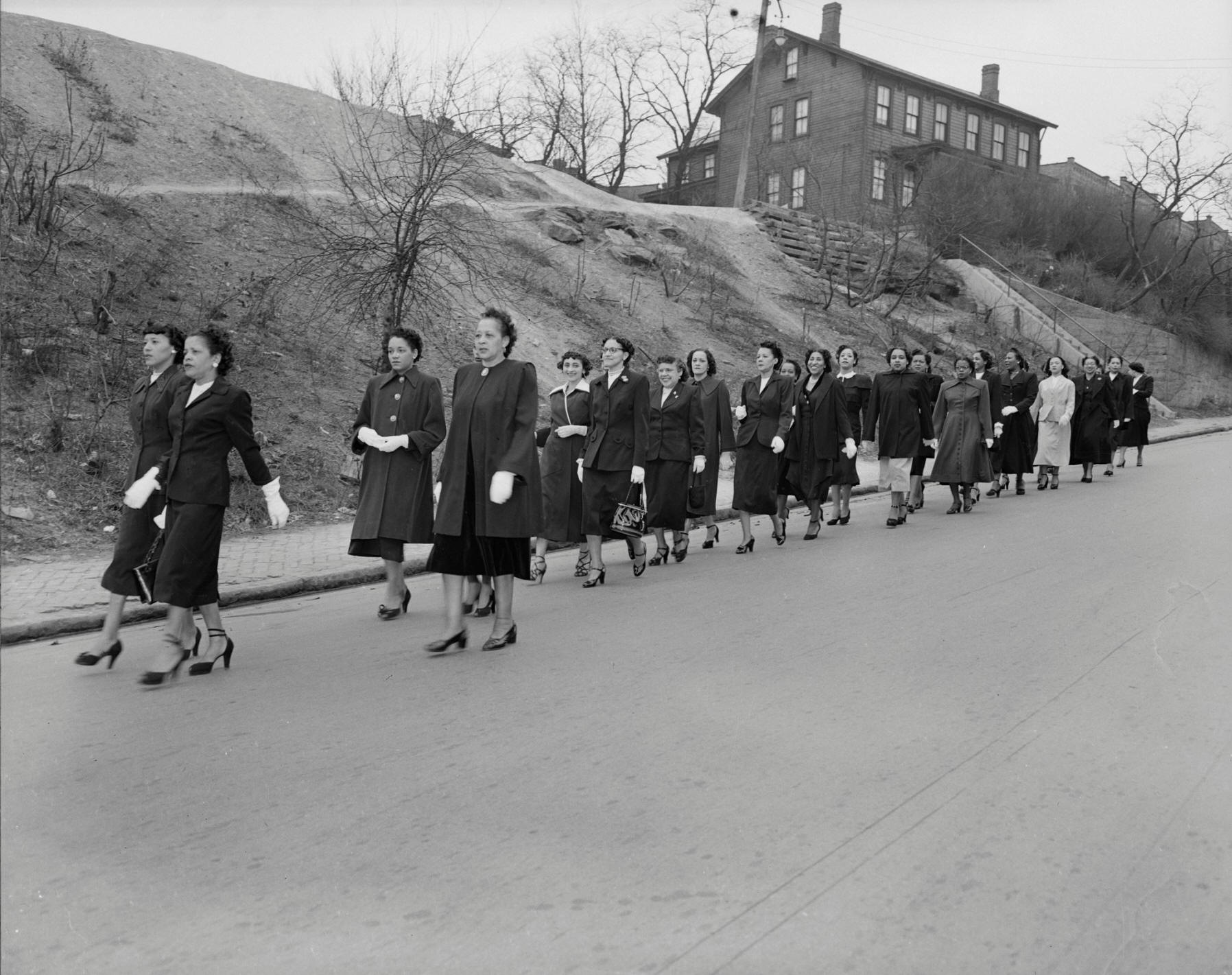 A procession of women, possibly including Ruby Wheeler Woods, second from left, and Cleo Holloway Keith, fifth from left, walking down Webster Avenue for the funeral of Leon (Pigmeat) Clark. Hill District. April 19, 1950.
