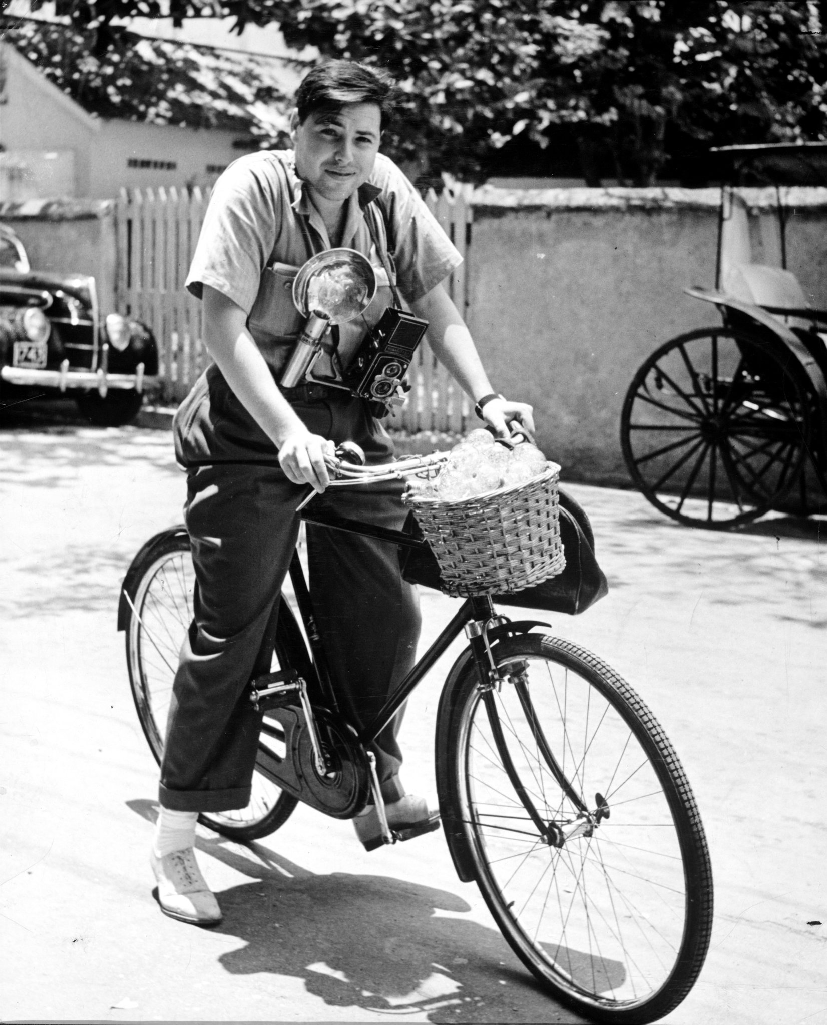 Mr. Morse is seen here in 1940, riding a bicycle with a camera around his neck and a basket full of flashbulbs.