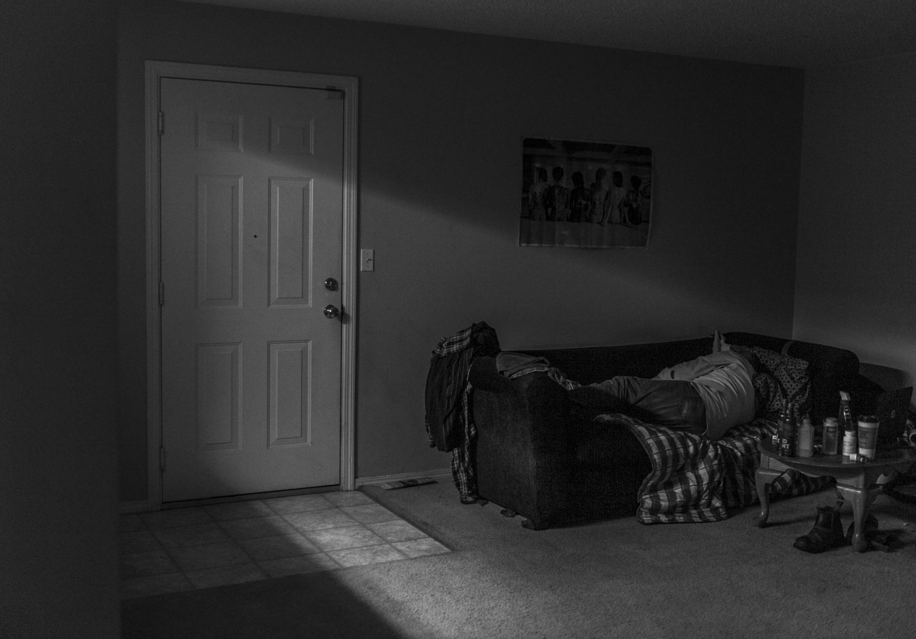 Mr. Capshaw sleeps on his living room couch with the kitchen light on.