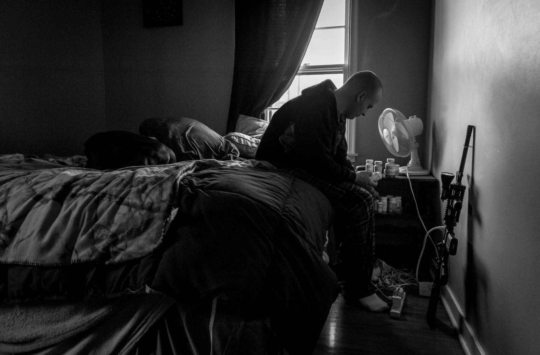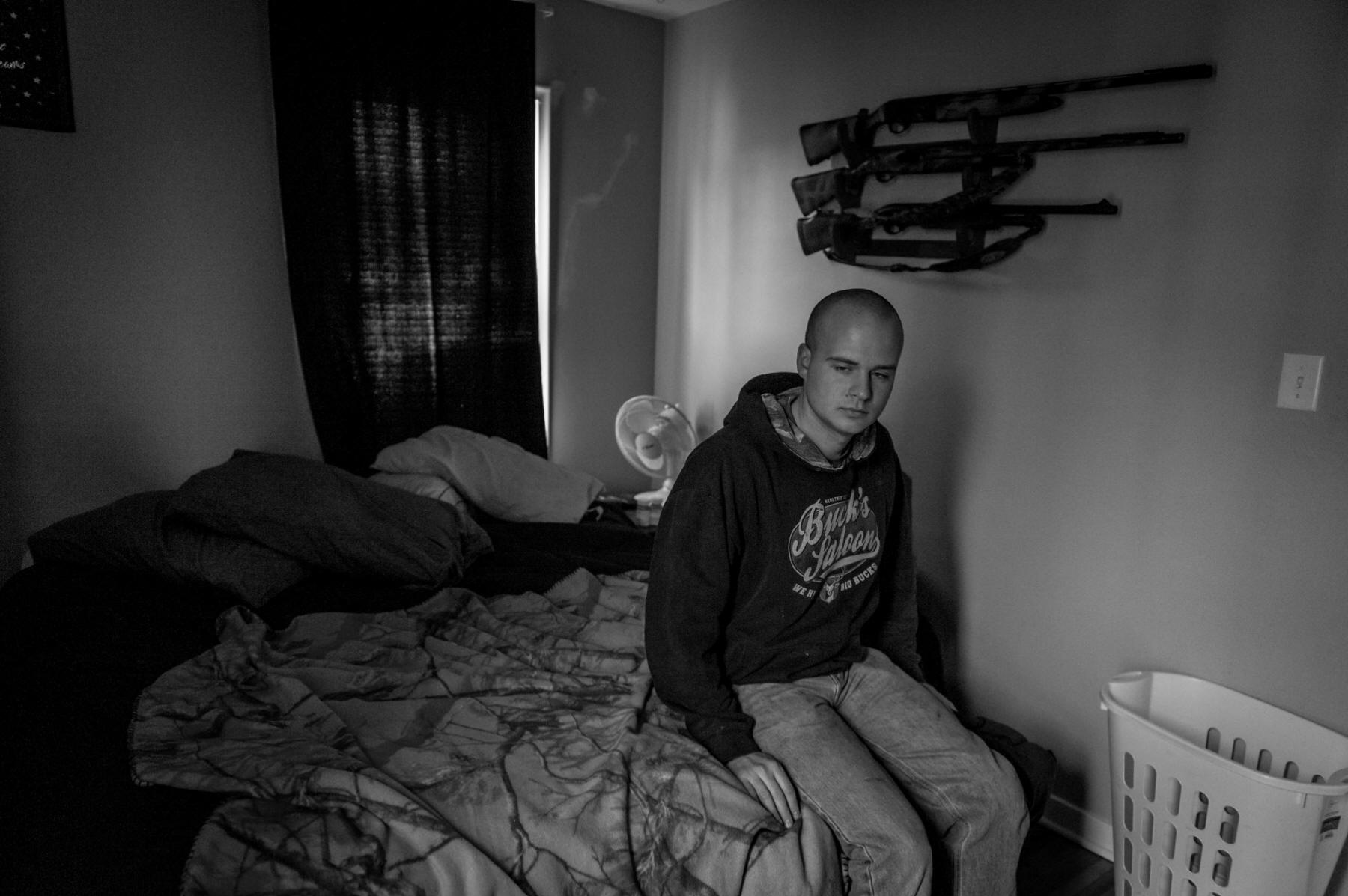 He sleeps with several weapons next to his bed at home in Austin, Minn.