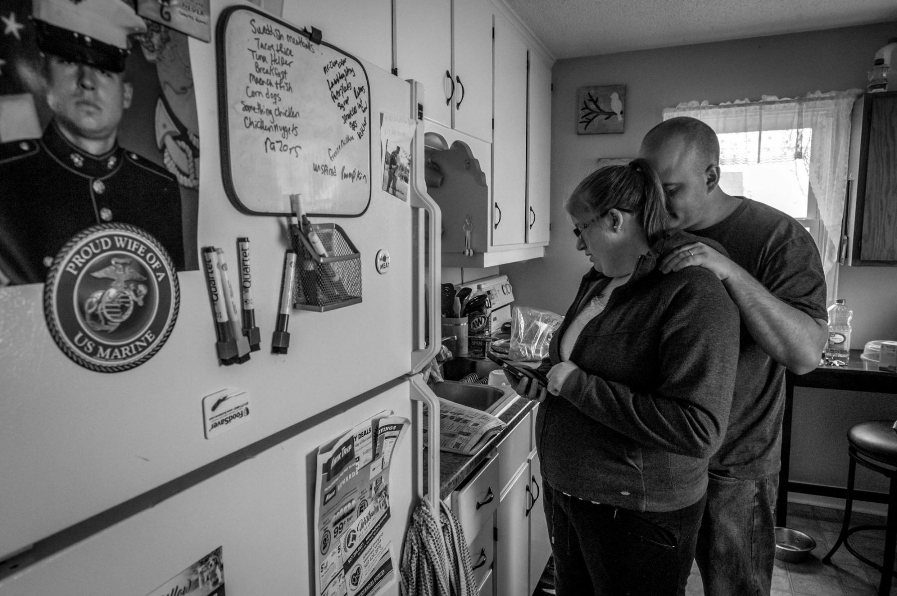 Mr. Hanson hugs his wife, Katie, in their kitchen.