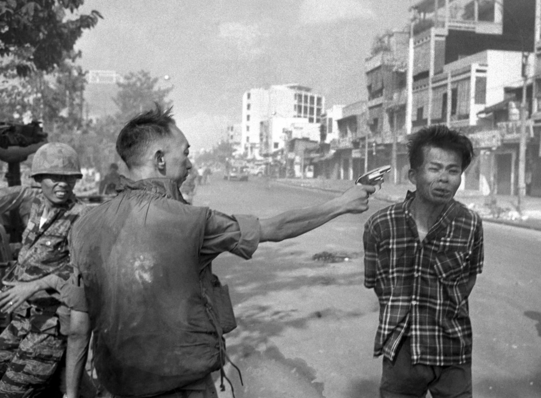 Gen Nguyen Ngoc Loan, South Vietnamese chief of the national police, fires his pistol into the head of suspected Vietcong official Nguyen Van Lem on a Saigon street early on in the Tet offensive, on 1 February 1968.