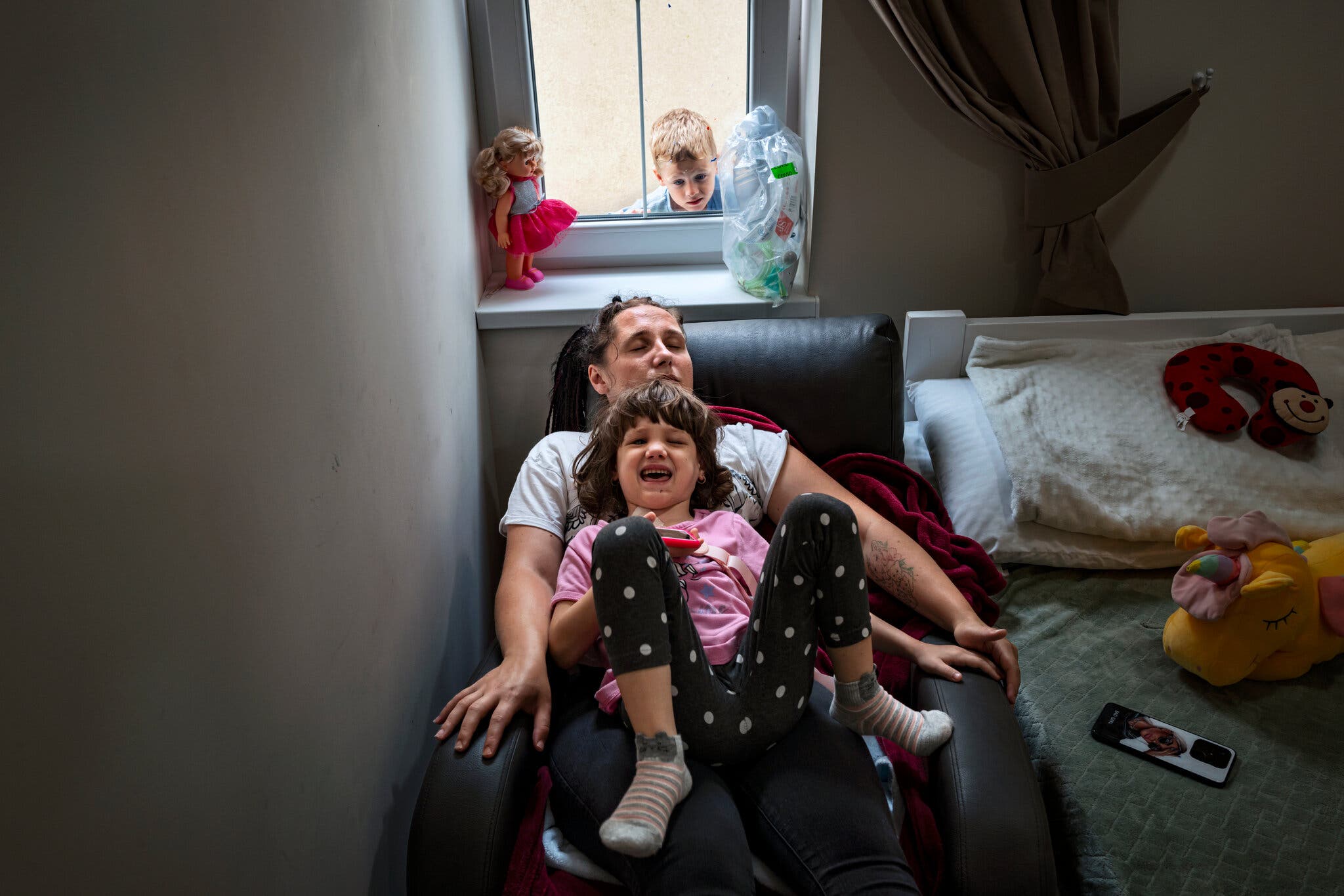 Sonya sitting with her mother, Natalia Kryvolapchuk, while she awaited additional painkillers after her regular dose of morphine.