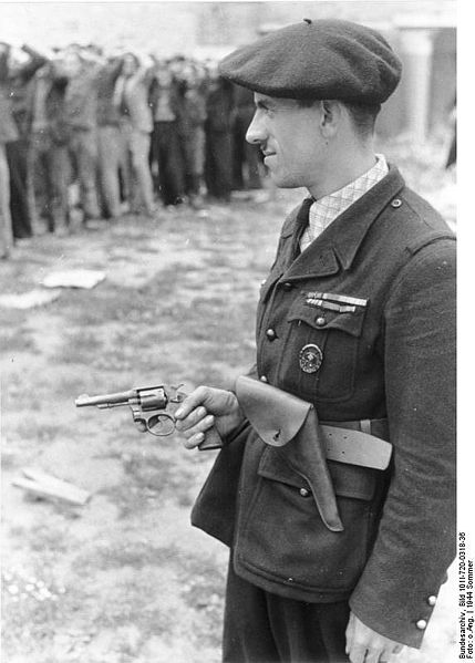 Summer 1944. Frankreich. Bewachung von festgenommenen Widerstandskämpfer durch französischen Milizionär mit Pistole; KBZ OB West 1944 Sommer
