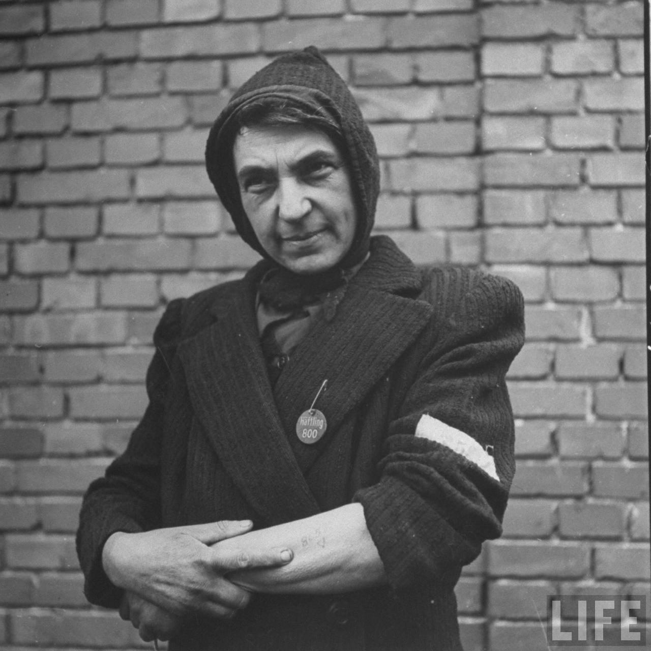 Hungarian Jew showing identification tattoo on her forearm given her by the Nazis after she was rounded up and forced into a labor camp.