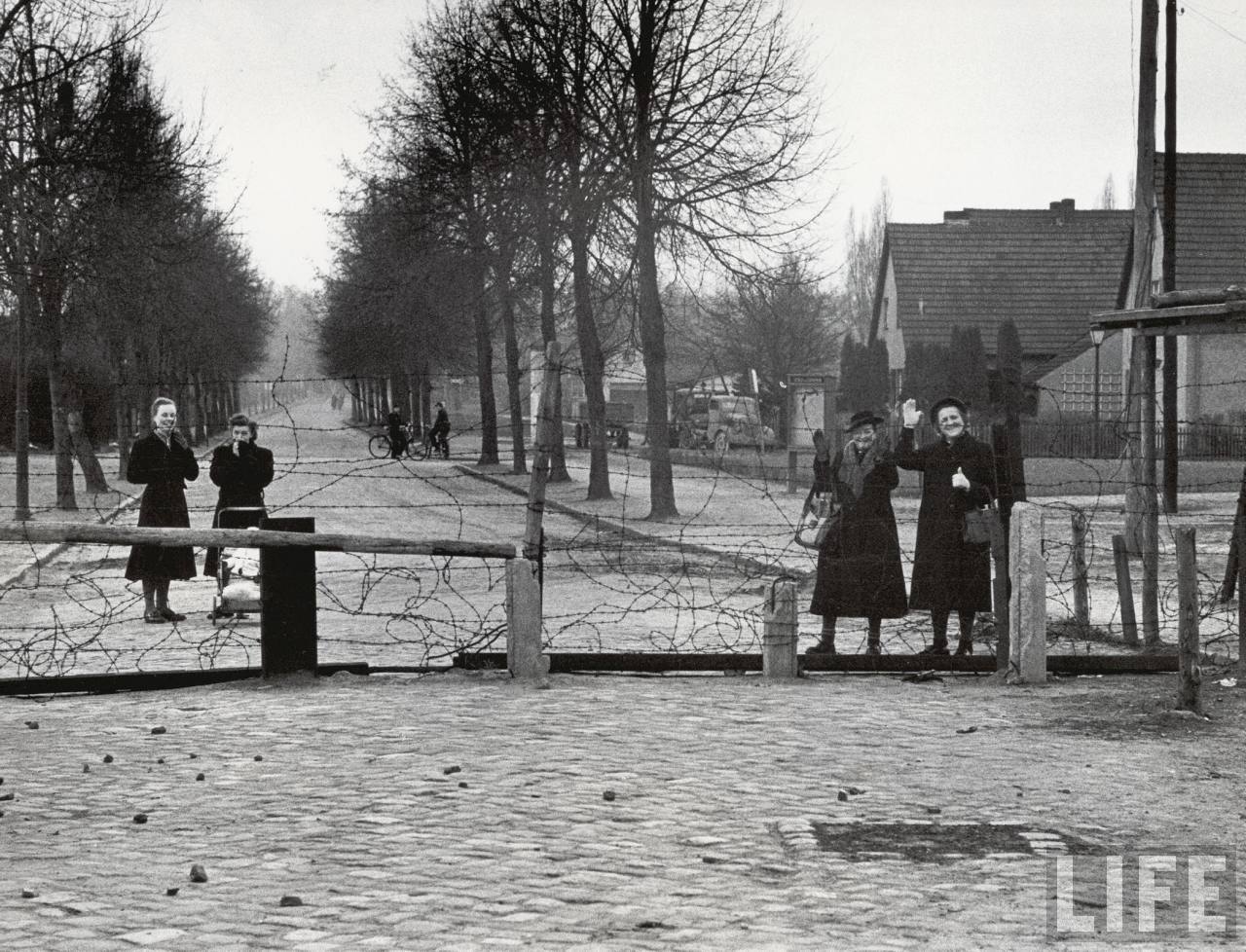 East Berlin women waving plaintful greetings to their West Berllin friends across the barbed-wire barricade, which later became the Berlin wall.