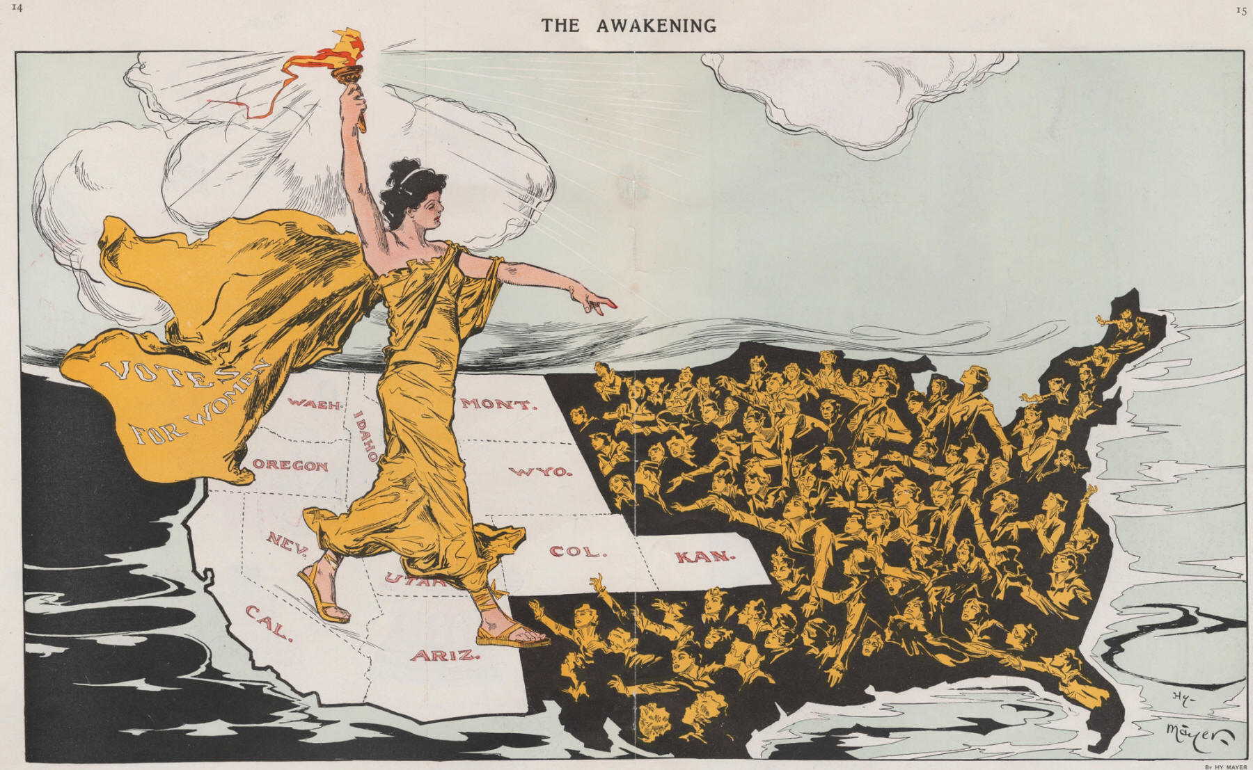 A 1915 illustration by Henry Mayer, titled “The Awakening,” suggested the geographical force behind the suffrage movement.