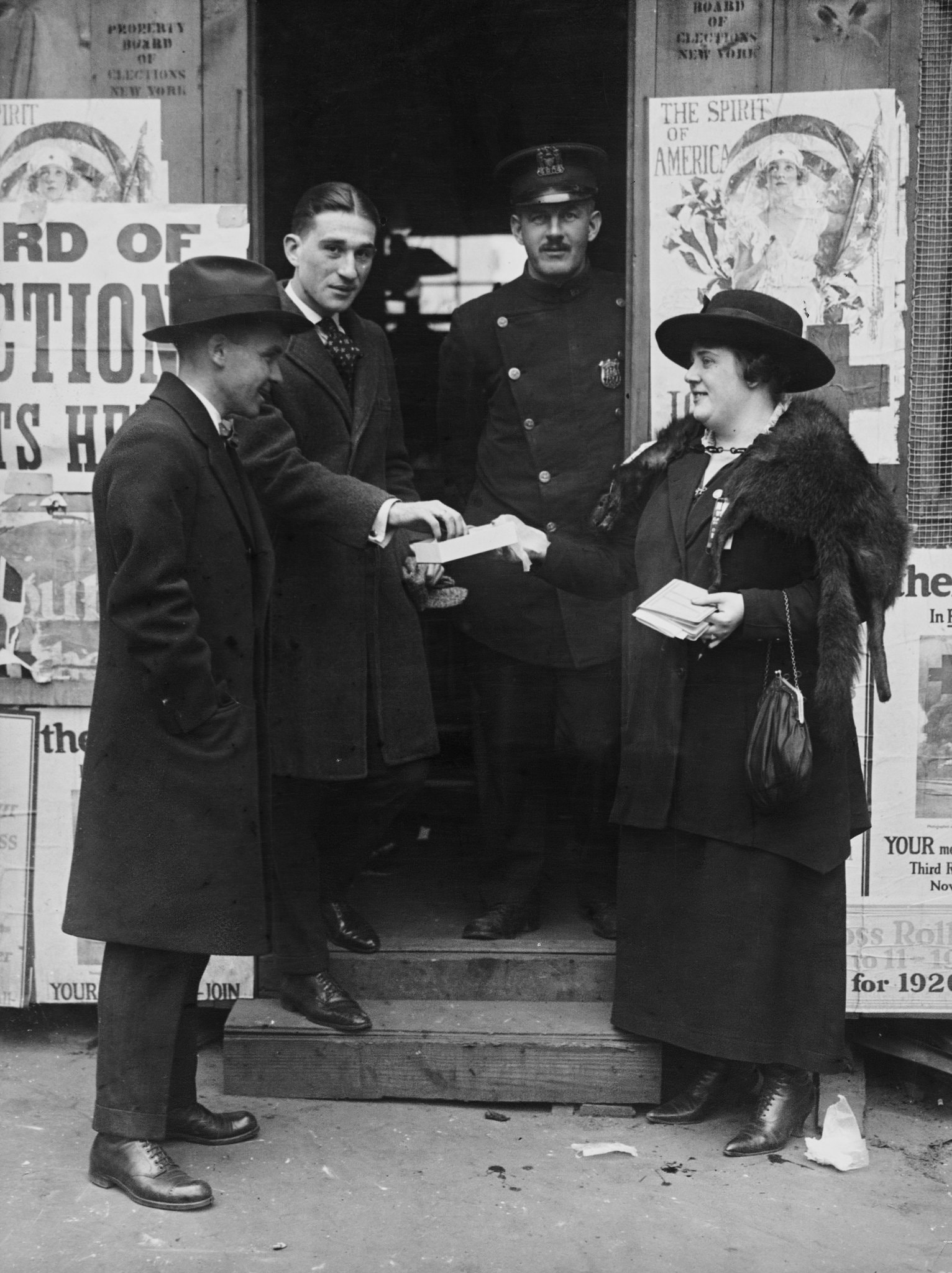 A suffragist gave out bonbons to men at a polling place in New York on Election Day in November 1918.