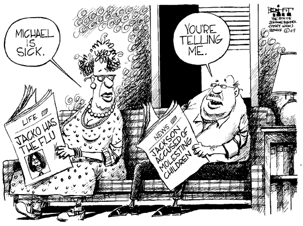 Contexte : Accusé d'attouchements par un jeune garçon, le chanteur Michael Jackson ne peut se rendre à son procès car il a la grippe.