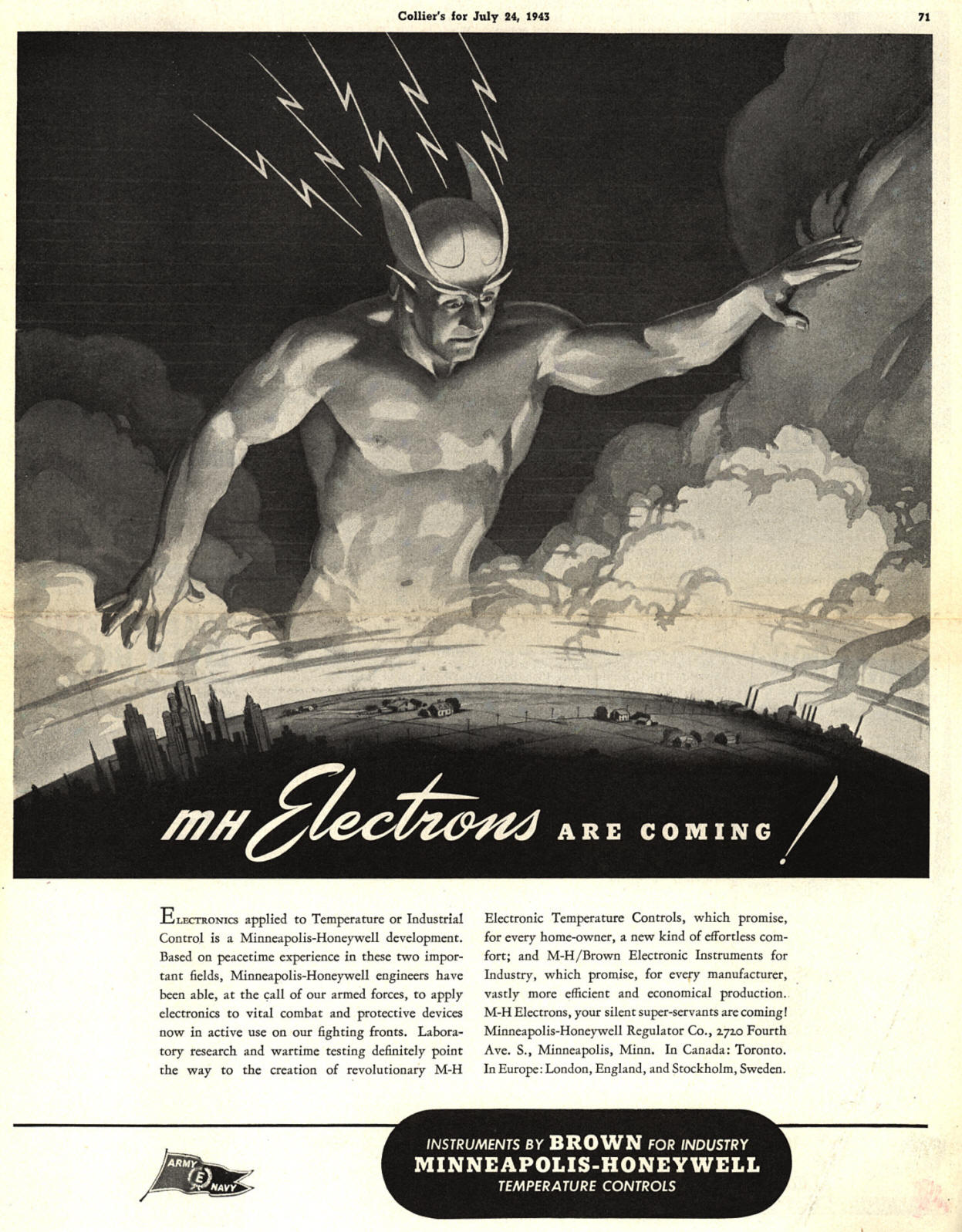 MH Electrons Are Coming! Collection: Ad*Access Company: Minneapolis-Honeywell Product: Minneapolis-Honeywell Publication: Colliers Publication Type: Magazine Year: 1943 Number of Pages: 1 Subject: Radio--War Illustration--Drawing Item Number: R0881 Duke University http://library.duke.edu/digitalcollections/adaccess.R0881/